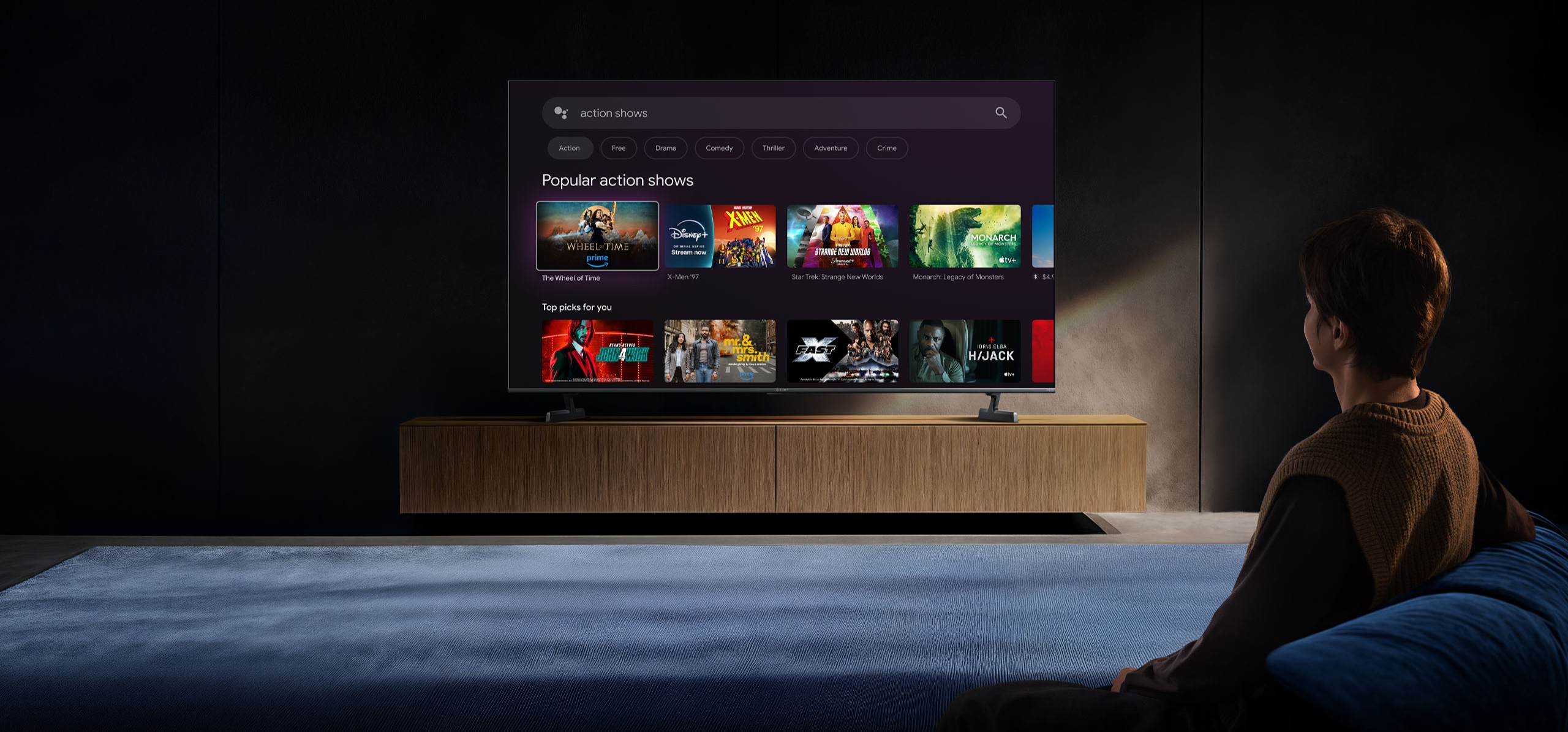 Xiaomi TV S Mini LED 65″ (2026) выполнен в современном минималистичном стиле с тонкой рамкой и чёрной подставкой. Узкие рамки позволяют полностью сосредоточиться на изображении, а лаконичный дизайн гармонично вписывается в любой интерьер. Телевизор одинаково хорошо подходит как для настенного крепления, так и для установки на тумбе.
