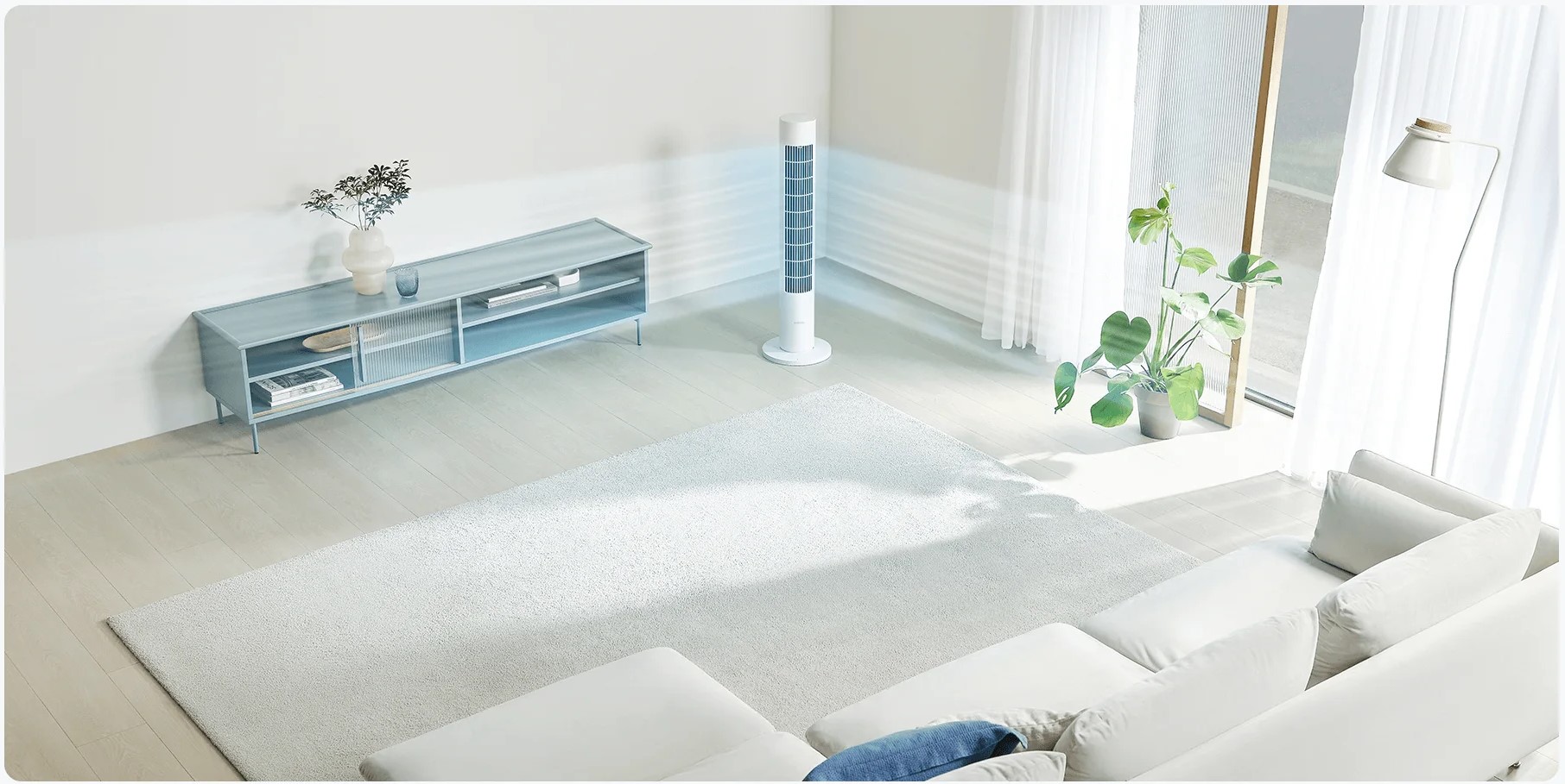 Конструкция воздухоотвода длиной 60 см обеспечивает обширный поток воздуха, а широкоугольная вентиляция на 150° ускоряет циркуляцию воздуха в помещении, что дает более быстрое охлаждение. Также, можно настроить различные углы обдува с помощью приложения Xiaomi Home.